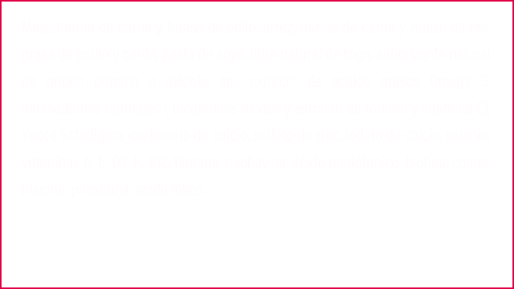 Con carne de res y pollo fuente de proteína de alto valor biológico y Yucca Schidigera que ayuda en su proceso digestivo optimizando el aprovechamiento óptimo de nutrientes.